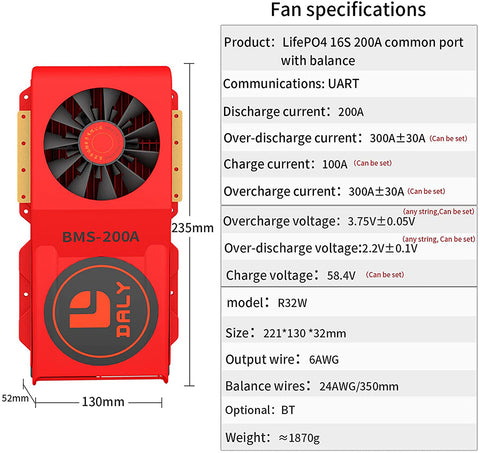Placa de ventilador BMS Daly Smart Lifepo4 16S 48V 200A Li-ion 16S 60V 250A con Bluetooth 52 130 235