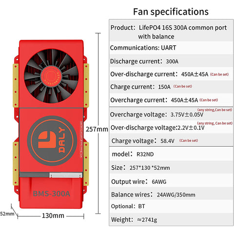 Placa de ventilador BMS Daly Smart Lifepo4 16S 48V 300A Li-ion 16S 60V 300A con Bluetooth 52 130 257