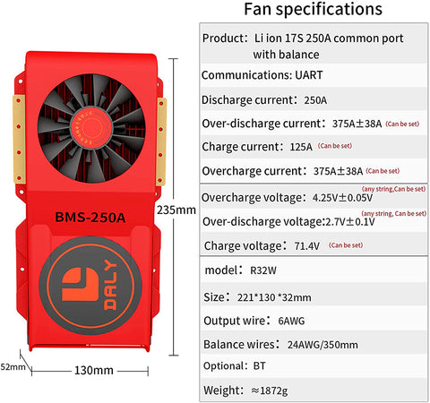 Placa de ventilador BMS con Bluetooth, ion de litio 17S 60 V 250 A, Daly Smart BMS, 52 130 235