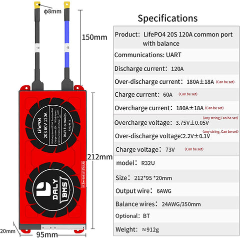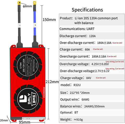 Placa BMS Daly Smart LifePO4 20S 60V 120A Li-ion 20S 72V 120A con Bluetooth 20 95 212