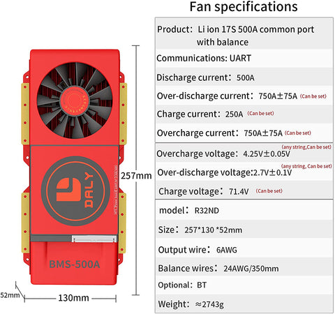 Carte de ventilateur Daly Smart BMS Li-ion 17S 60V 500A Bluetooth BMS 52 130 257