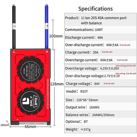 Daly smart bms Li-ion 20S 72V 40A bluetooth BMS board 18 66 128