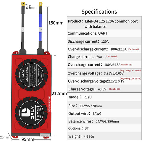 Daly smart bms Lifepo4 12S 36V 120A bluetooth BMS board 20 95 212