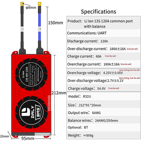 Daly smart bms Li-ion 13S 48V 120A bluetooth BMS board 20 95 212