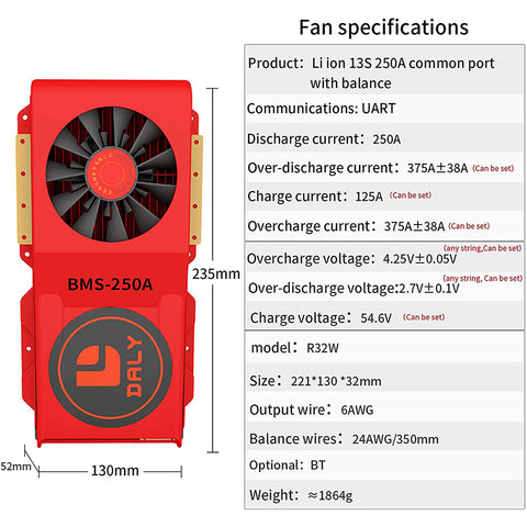 Daly smart bms Li-ion 13S 48V 250A bluetooth BMS FAN board 52 130 235