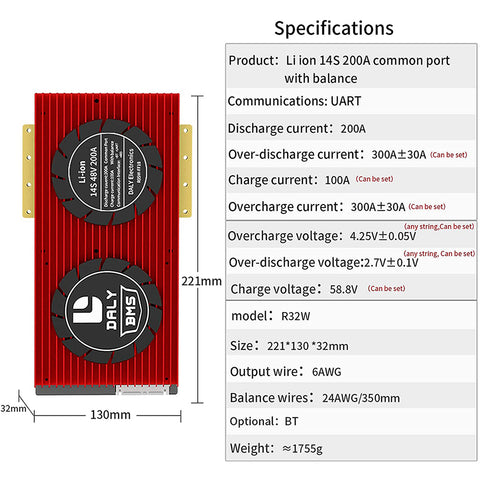 Daly smart bms Li-ion 14S 48V 200A bluetooth BMS board 32130221