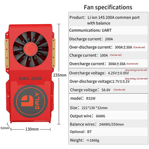 Daly smart bms Li-ion 14S 48V 200A bluetooth BMS FAN board 52 130 235