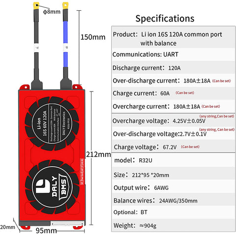 Daly smart bms Lifepo4 16S 48V 120A Li-ion 16S 60V 120A bluetooth BMS board 20 95 212