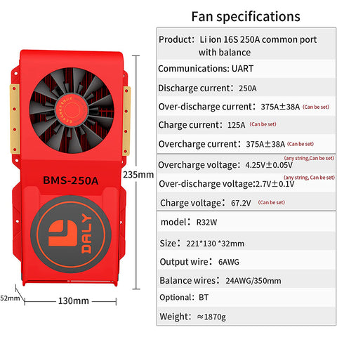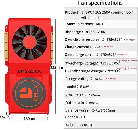 Daly smart bms Lifepo4 16S 48V 250A Li-ion 16S 60V 250A bluetooth BMS FAN board 52 130 235