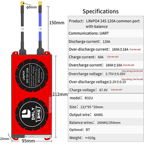 Daly smart bms LifePO4 24S 72V 120A bluetooth BMS board 20 95 212