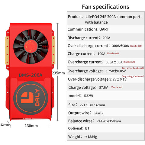 Daly smart bms LifePO4 24S 72V 200A bluetooth BMS FAN board 52 130 235