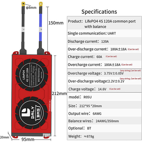 Daly smart bms Lifepo4 4S 12V 120A bluetooth BMS board 20 95 212