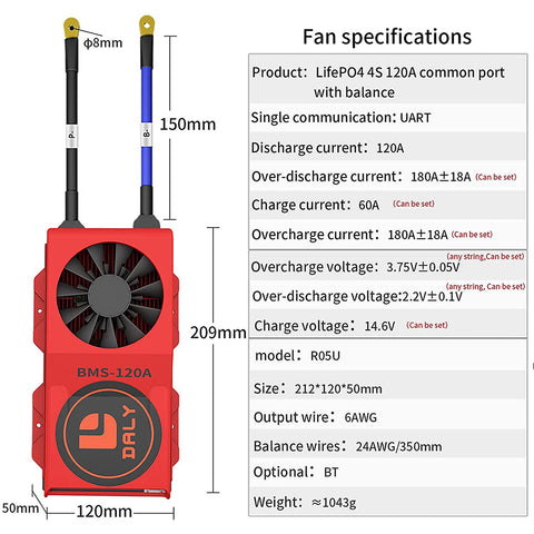 Daly smart bms Lifepo4 4S 12V 120A bluetooth BMS FAN board 50 120 209