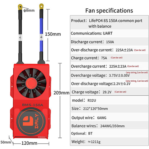 Daly smart bms Lifepo4 8S 24V 150A bluetooth BMS FAN board 50 120 209